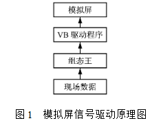 模擬板的顯示信號(hào)驅(qū)動(dòng)是通過(guò)一臺(tái)計(jì)算機(jī)通過(guò)RS232串口控制的。在后臺(tái)運(yùn)行的VB驅(qū)動(dòng)程序從同一臺(tái)計(jì)算機(jī)上運(yùn)行的組態(tài)王獲取數(shù)據(jù)。該計(jì)算機(jī)通過(guò)以太網(wǎng)獲取工業(yè)現(xiàn)場(chǎng)安裝的各種傳感器采集的信息,并通過(guò)DDE技術(shù)將數(shù)據(jù)傳輸?shù)侥M板驅(qū)動(dòng)程序,從而實(shí)現(xiàn)模擬板動(dòng)態(tài)顯示現(xiàn)場(chǎng)設(shè)備的運(yùn)行情況。模擬板信號(hào)驅(qū)動(dòng)的原理如下圖所示。