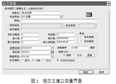DDE通信始終發(fā)生在客戶應(yīng)用程序和服務(wù)器應(yīng)用程序之間。本文作者使用Visual Basic可視化高級(jí)編程語(yǔ)言編寫(xiě)了模擬板的驅(qū)動(dòng)程序。在Visual Basic的可視化編程工具中,DDE通過(guò)控件的屬性和方法來(lái)實(shí)現(xiàn)連接,其過(guò)程通過(guò)應(yīng)用程序名(application)、主題(topic)和項(xiàng)目(item)這三個(gè)標(biāo)識(shí)名進(jìn)行約定。例如,"有功功率"變量通過(guò)現(xiàn)場(chǎng)電量采集模塊(采用山東力創(chuàng)EDA9033)進(jìn)行采集,組態(tài)王建立了"EDA9033"設(shè)備和"有功功率"變量,并允許DDE訪問(wèn)數(shù)據(jù),如下圖所示。